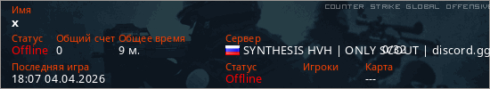 Играет на Counter Strike Global Offensive сервере. Страна: РоссияПервый раз замечен 17:48 03.04.2026