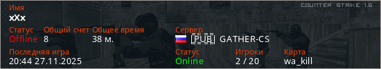 Играет на Counter Strike 1.6 сервере. Страна: РоссияПервый раз замечен 17:51 23.06.2025