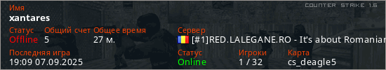 Играет на Counter Strike 1.6 сервере. Страна: РумынияПервый раз замечен 00:36 30.07.2022