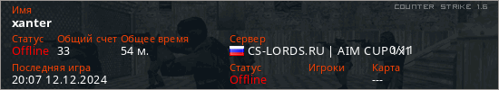 Играет на Counter Strike 1.6 сервере. Страна: РоссияПервый раз замечен 16:54 04.12.2024