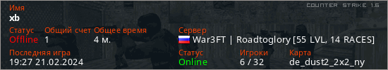 Играет на Counter Strike 1.6 сервере. Страна: РоссияПервый раз замечен 19:25 21.02.2024