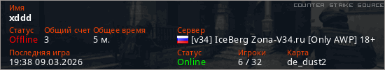 Играет на Counter Strike Source сервере. Страна: РоссияПервый раз замечен 19:36 09.03.2026