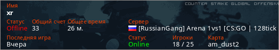 Играет на Counter Strike Global Offensive сервере. Страна: РоссияПервый раз замечен 12:59 17.04.2026