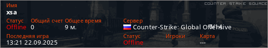 Играет на Counter Strike Source сервере. Страна: РоссияПервый раз замечен 12:29 22.09.2025