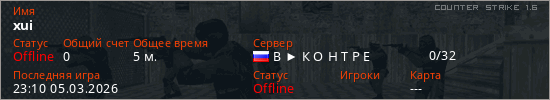 Играет на Counter Strike 1.6 сервере. Страна: РоссияПервый раз замечен 23:08 05.03.2026