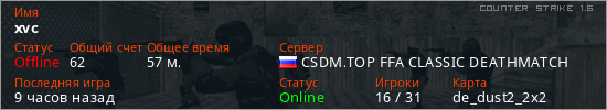 Играет на Counter Strike 1.6 сервере. Страна: РоссияПервый раз замечен 21:27 15.07.2023