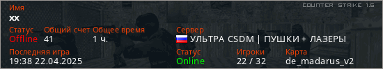 Играет на Counter Strike 1.6 сервере. Страна: РоссияПервый раз замечен 23:48 26.01.2025