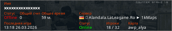 Играет на Counter Strike 1.6 сервере. Страна: ГерманияПервый раз замечен 13:02 17.03.2026