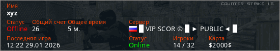 Играет на Counter Strike 1.6 сервере. Страна: РоссияПервый раз замечен 07:41 29.01.2026