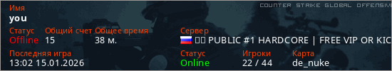 Играет на Counter Strike Global Offensive сервере. Страна: РоссияПервый раз замечен 18:08 01.01.2026