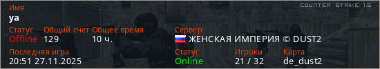 Играет на Counter Strike 1.6 сервере. Страна: РоссияПервый раз замечен 22:20 14.02.2025