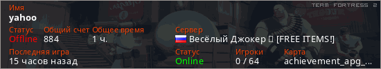 Играет на Team Fortress 2 сервере. Страна: РоссияПервый раз замечен 22:17 13.03.2026