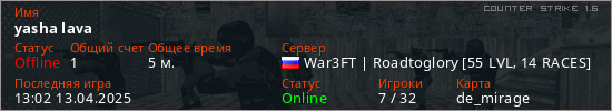 Играет на Counter Strike 1.6 сервере. Страна: РоссияПервый раз замечен 12:39 13.04.2025