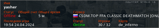 Играет на Counter Strike 1.6 сервере. Страна: РоссияПервый раз замечен 19:43 24.04.2024