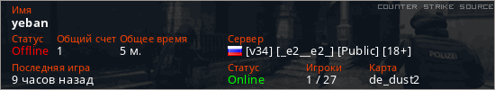 Играет на Counter Strike Source сервере. Страна: РоссияПервый раз замечен 21:49 12.01.2026