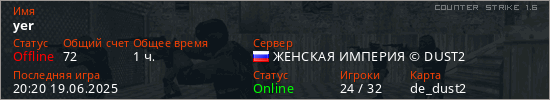 Играет на Counter Strike 1.6 сервере. Страна: РоссияПервый раз замечен 22:53 05.01.2025