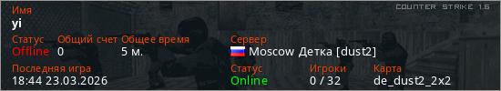 Играет на Counter Strike 1.6 сервере. Страна: РоссияПервый раз замечен 18:39 23.03.2026