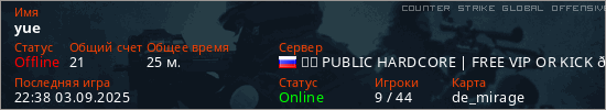 Играет на Counter Strike Global Offensive сервере. Страна: РоссияПервый раз замечен 15:53 02.08.2025