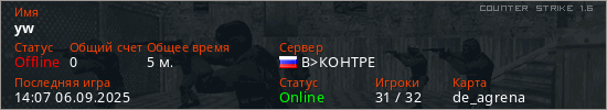Играет на Counter Strike 1.6 сервере. Страна: РоссияПервый раз замечен 14:00 06.09.2025