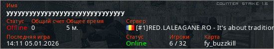 Играет на Counter Strike 1.6 сервере. Страна: РумынияПервый раз замечен 14:07 05.01.2026