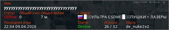 Играет на Counter Strike 1.6 сервере. Страна: РоссияПервый раз замечен 22:30 09.04.2026