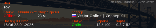 Играет на Criminal Russia Multiplayer сервере. Страна: РоссияПервый раз замечен 14:28 28.01.2026