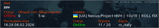 Играет на Counter Strike Global Offensive сервере. Страна: УкраинаПервый раз замечен 18:26 08.02.2026