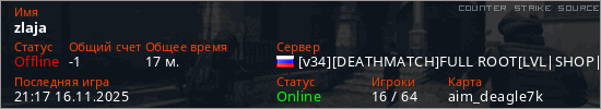 Играет на Counter Strike Source сервере. Страна: РоссияПервый раз замечен 19:49 11.11.2025