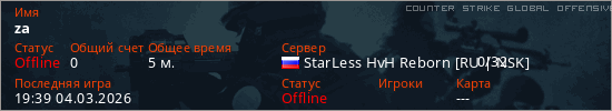Играет на Counter Strike Global Offensive сервере. Страна: РоссияПервый раз замечен 19:10 04.03.2026