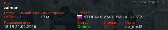 Играет на Counter Strike 1.6 сервере. Страна: РоссияПервый раз замечен 15:40 03.02.2026