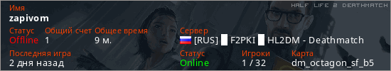 Играет на Half Life 2 DeathMatch сервере. Страна: РоссияПервый раз замечен 18:28 25.12.2025