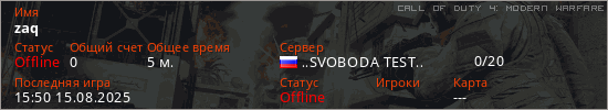 Играет на Call of Duty 4: Modern Warfare сервере. Страна: РоссияПервый раз замечен 15:46 15.08.2025