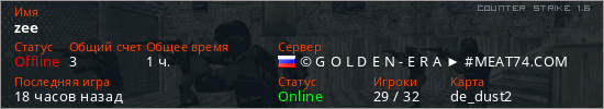 Играет на Counter Strike 1.6 сервере. Страна: РоссияПервый раз замечен 17:16 09.09.2025