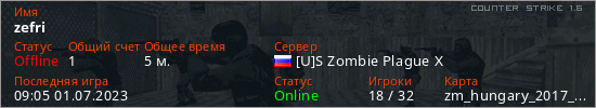 Играет на Counter Strike 1.6 сервере. Страна: РоссияПервый раз замечен 09:01 01.07.2023