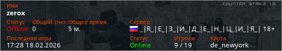 Играет на Counter Strike 1.6 сервере. Страна: РоссияПервый раз замечен 17:26 18.02.2026