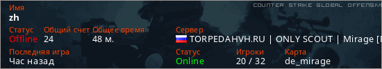 Играет на Counter Strike Global Offensive сервере. Страна: РоссияПервый раз замечен 17:38 27.01.2026