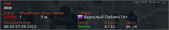 Играет на Counter Strike 1.6 сервере. Страна: РоссияПервый раз замечен 00:33 07.09.2023