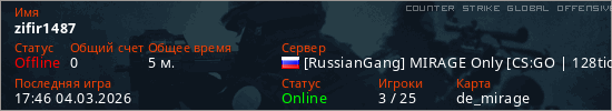 Играет на Counter Strike Global Offensive сервере. Страна: РоссияПервый раз замечен 17:40 04.03.2026