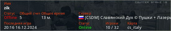 Играет на Counter Strike 1.6 сервере. Страна: РоссияПервый раз замечен 19:07 15.12.2024