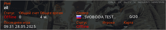 Играет на Call of Duty 4: Modern Warfare сервере. Страна: РоссияПервый раз замечен 09:29 28.05.2025