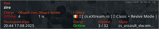 Играет на Counter Strike 1.6 сервере. Страна: РумынияПервый раз замечен 18:25 29.01.2025