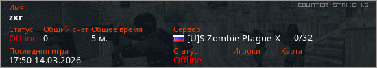 Играет на Counter Strike 1.6 сервере. Страна: РоссияПервый раз замечен 17:22 14.03.2026