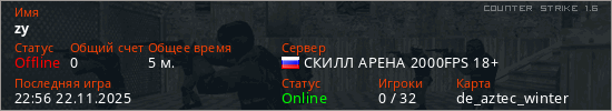 Играет на Counter Strike 1.6 сервере. Страна: РоссияПервый раз замечен 22:27 22.11.2025