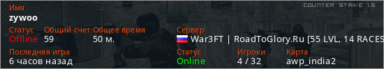 Играет на Counter Strike 1.6 сервере. Страна: РоссияПервый раз замечен 10:44 16.02.2026