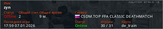 Играет на Counter Strike 1.6 сервере. Страна: РоссияПервый раз замечен 16:59 07.01.2026