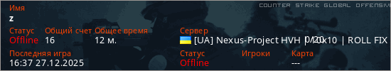Играет на Counter Strike Global Offensive сервере. Страна: УкраинаПервый раз замечен 16:09 27.12.2025