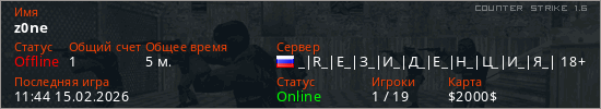 Играет на Counter Strike 1.6 сервере. Страна: РоссияПервый раз замечен 11:28 15.02.2026