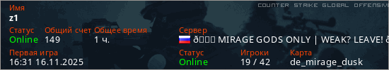 Играет на Counter Strike Global Offensive сервере. Страна: РоссияПервый раз замечен 16:31 16.11.2025
