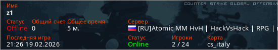 Играет на Counter Strike Global Offensive сервере. Страна: РоссияПервый раз замечен 21:18 19.02.2026