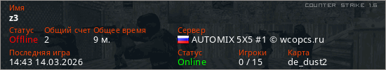 Играет на Counter Strike 1.6 сервере. Страна: РоссияПервый раз замечен 14:09 14.03.2026